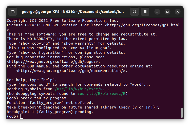 2. Podemos establecer un punto de interrupción en la función dada con break faulty_program. GDB lo capturará sobre la marcha, así que elige yes. Es muy probable que te advierta que no hay símbolo para esa función.