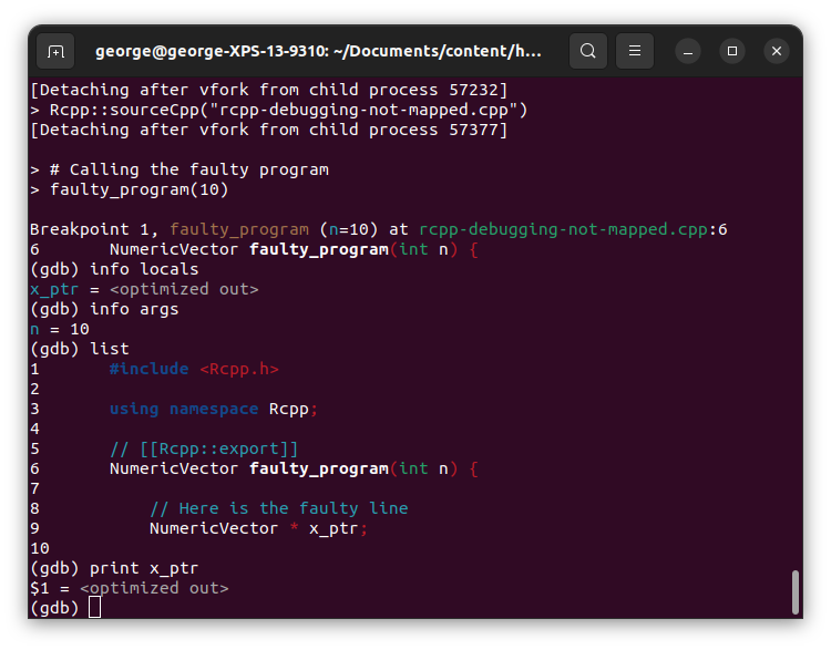 4. Obtener el programa usando Rcpp::sourceCpp, y esperar a que gdb pause el programa una vez que alcance el punto de interrupción.