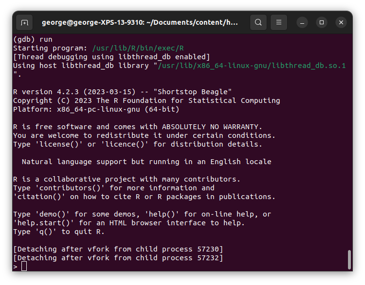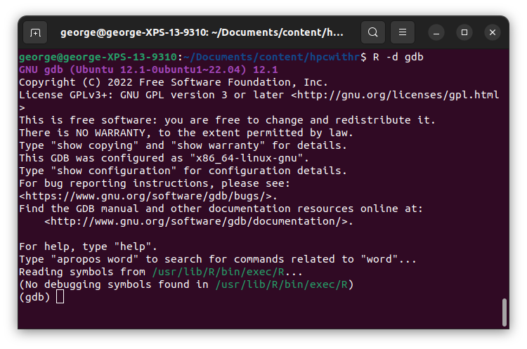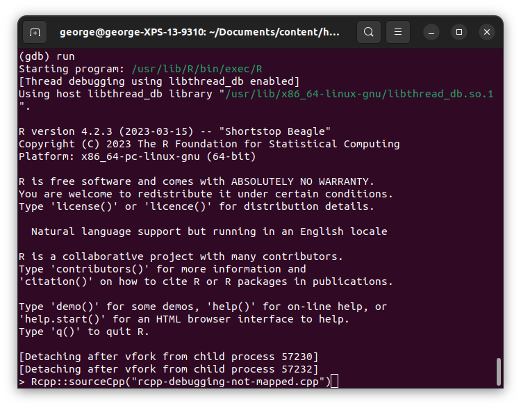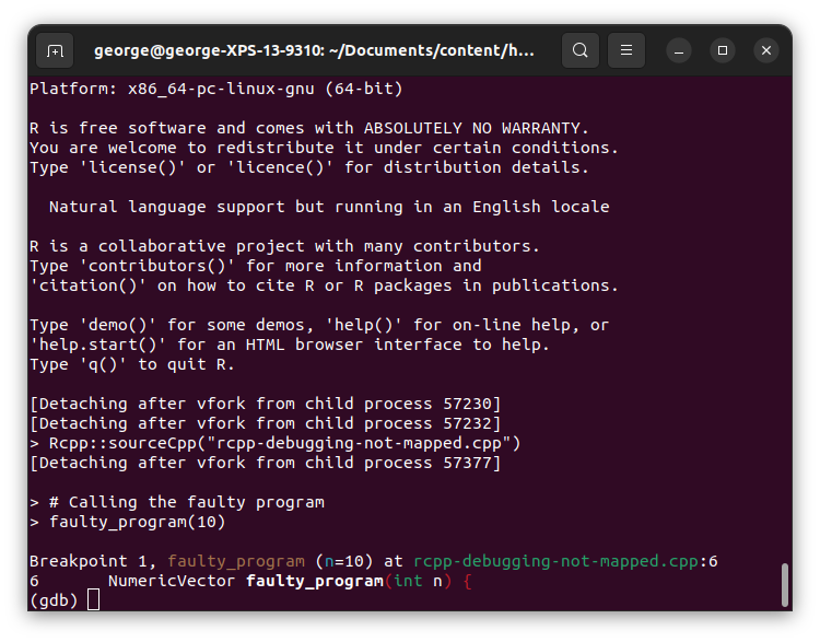 1. Ejecutar R con gdb como depurador: R --debugger=gdb. R no iniciará inmediatamente, así que tenemos tiempo para agregar puntos de interrupción.