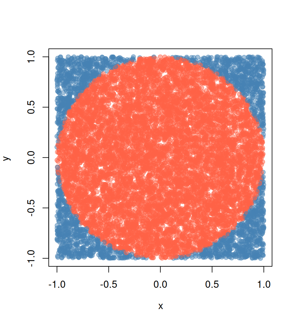 El siguiente es un ejemplo que muchas personas (incluyéndome) han usado para ilustrar computación paralela con R. El ejemplo es directo: queremos aproximar pi haciendo algunas simulaciones de Monte Carlo.